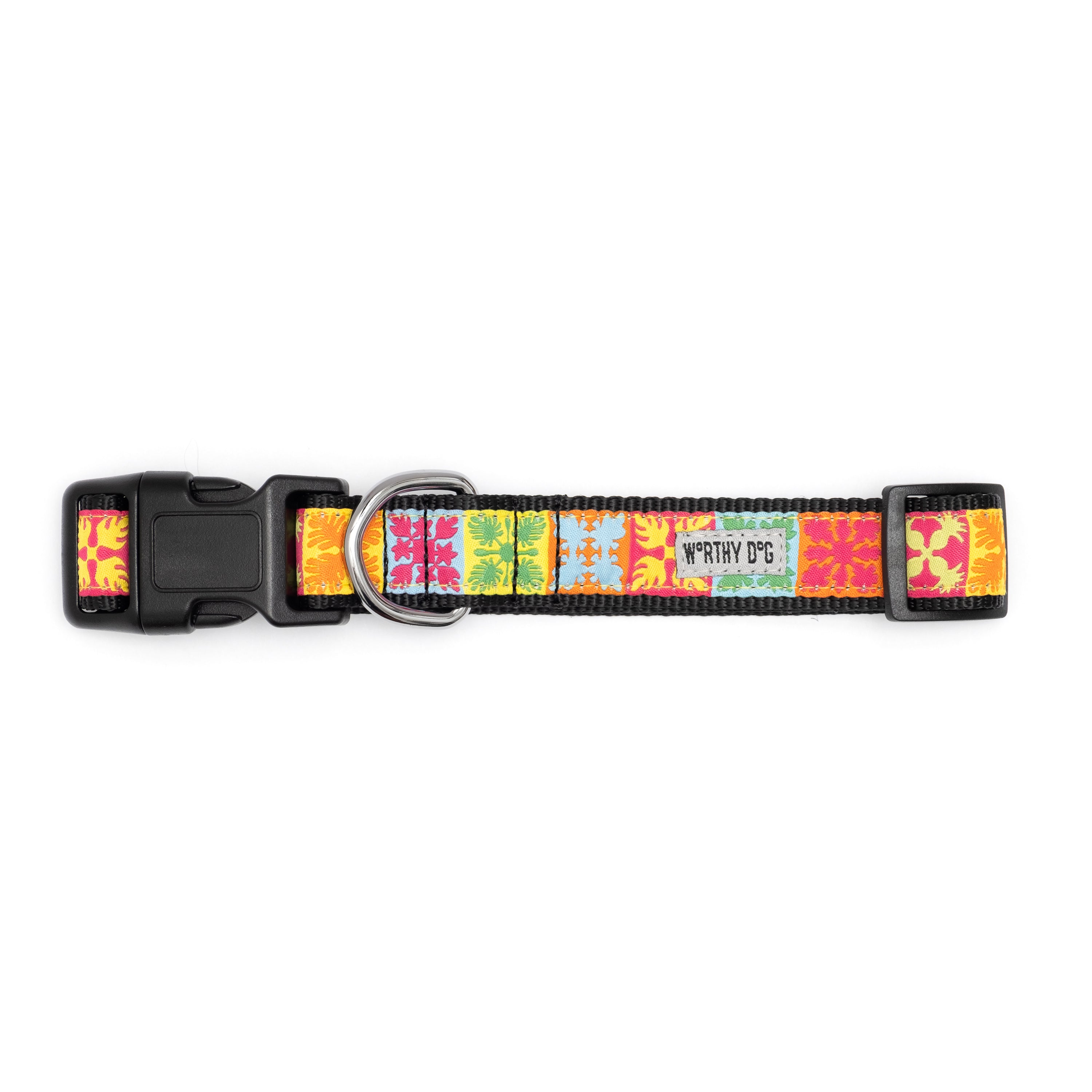 Give your dog a collar that looks great and lasts. This everyday collar pairs a woven patterned ribbon with strong, comfortable nylon webbing for style that stands up to daily wear. A secure quick-release buckle makes on/off fast (and easy to remove in an emergency), while the nickel-plated D-ring keeps ID tags and leashes within easy reach. Available in multiple sizes with generous adjustability to help you dial in the perfect fit for pups big and small.