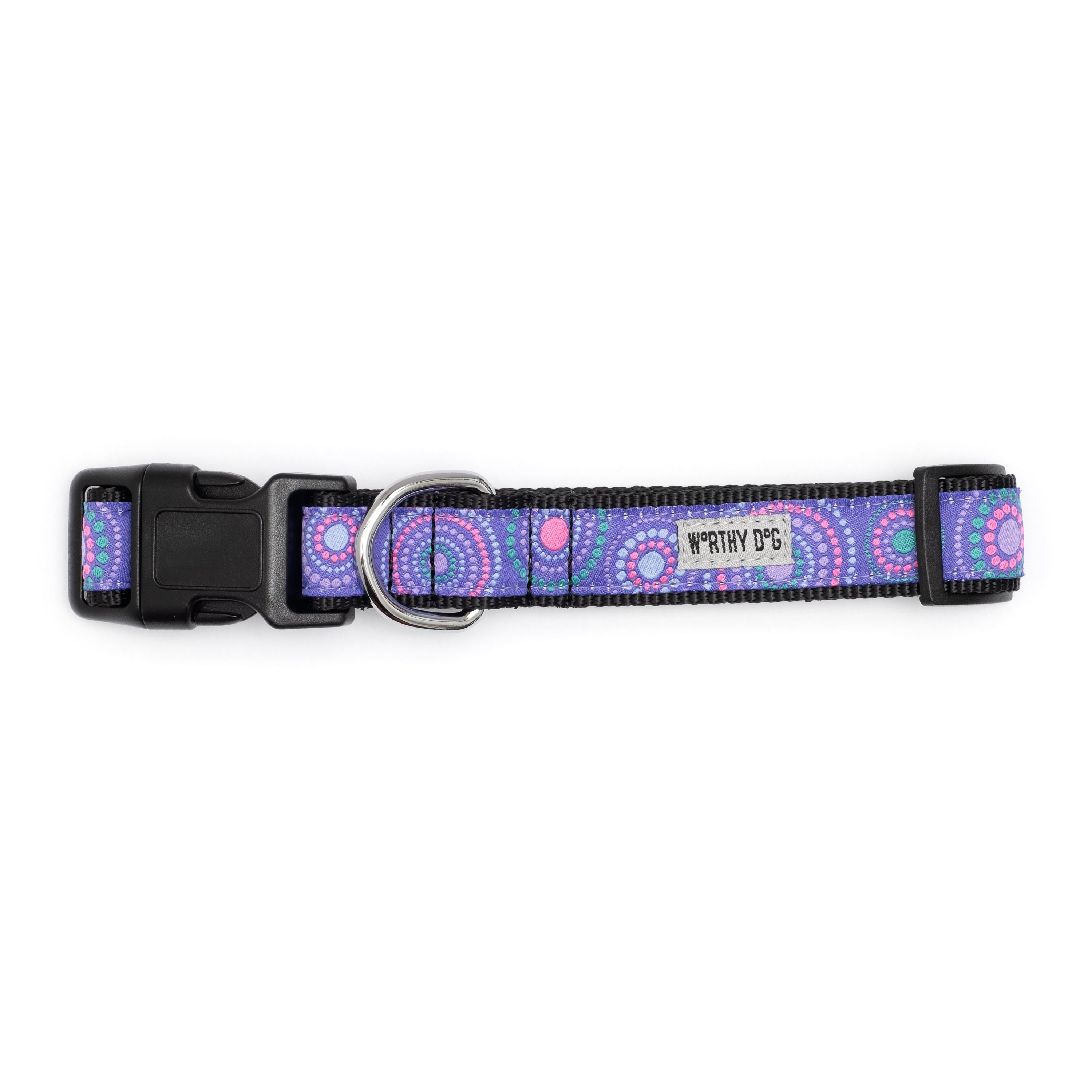 Give your dog a collar that looks great and lasts. This everyday collar pairs a woven patterned ribbon with strong, comfortable nylon webbing for style that stands up to daily wear. A secure quick-release buckle makes on/off fast (and easy to remove in an emergency), while the nickel-plated D-ring keeps ID tags and leashes within easy reach. Available in multiple sizes with generous adjustability to help you dial in the perfect fit for pups big and small.