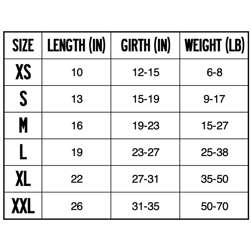 Size | Back Length (in) | Chest Girth (in) | Weight (lb guide) |